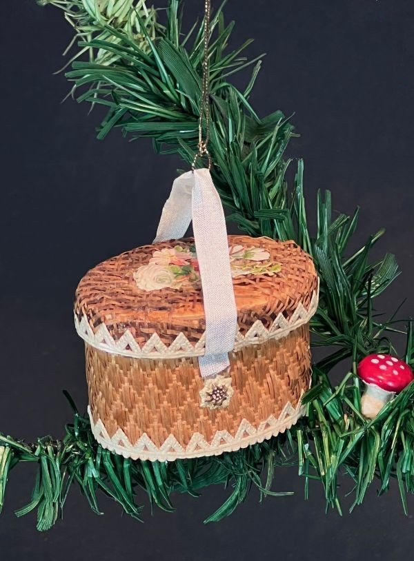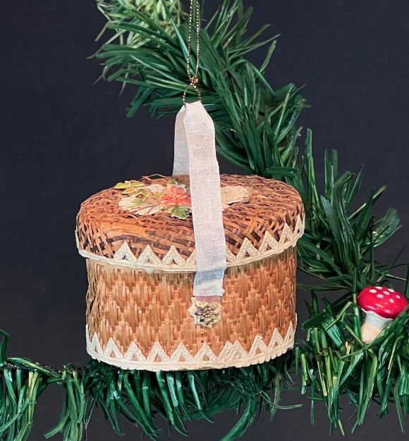 Erhaltung: am Deckel Fehlstellen beim Korbgeflecht und an der Bordüre,siehe Bilder