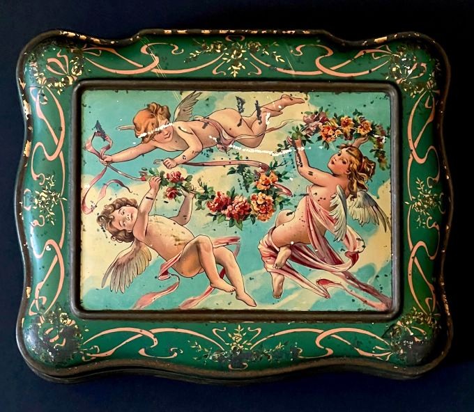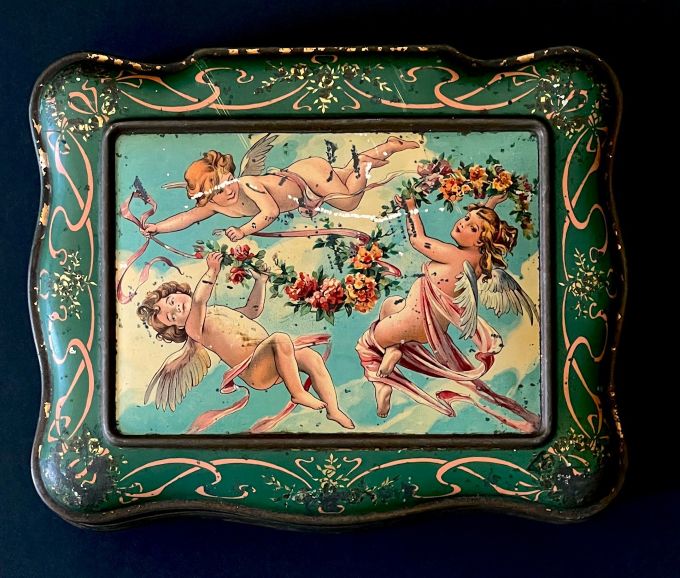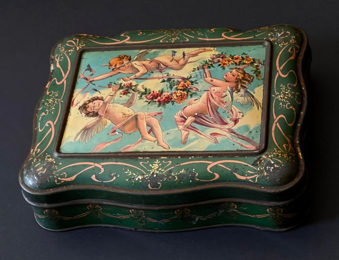 Antike, lithographierte Jugendstildose mit fliegenden Engeln