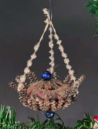 Antique ornament probably made of metal ( could possibly also be made of glass, not quite clear ) wrapped with bouillon wire and leonic wires