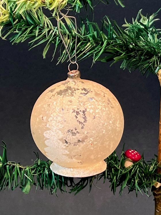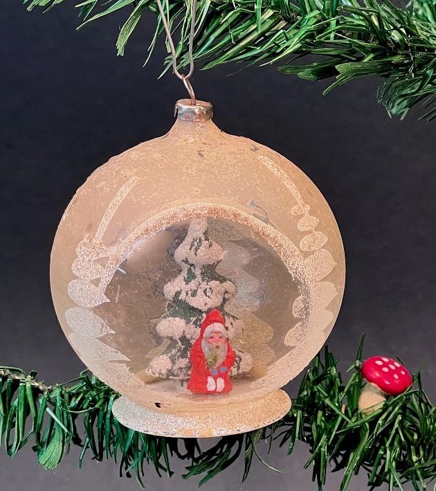 Old diorama ornament with an internal fir tree and Christmas tree made of composition