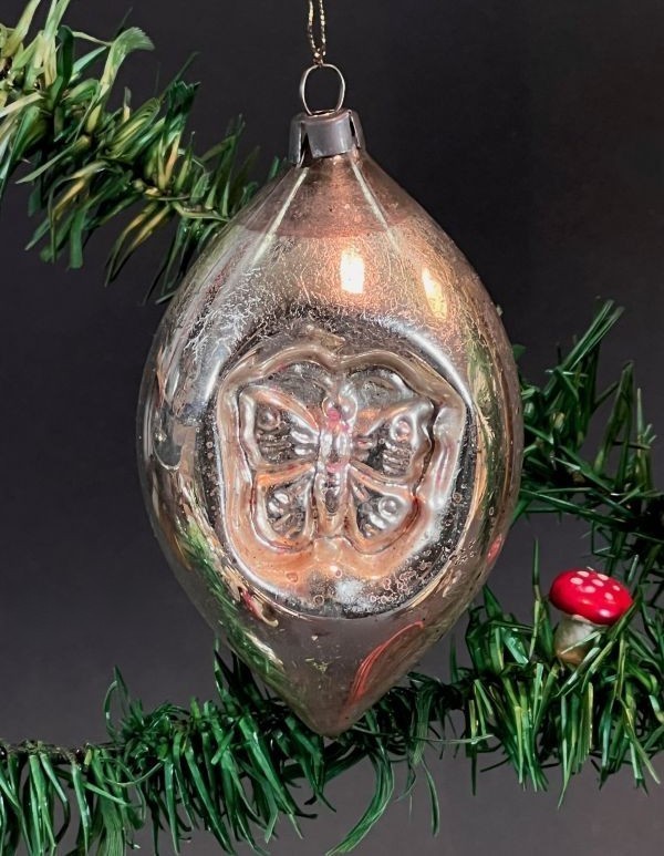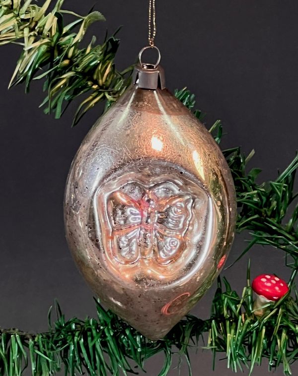 Antique silver ornament, elliptical with butterfly engraving on both sides.