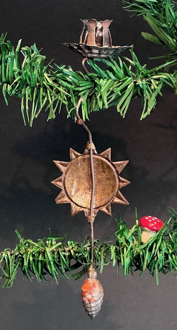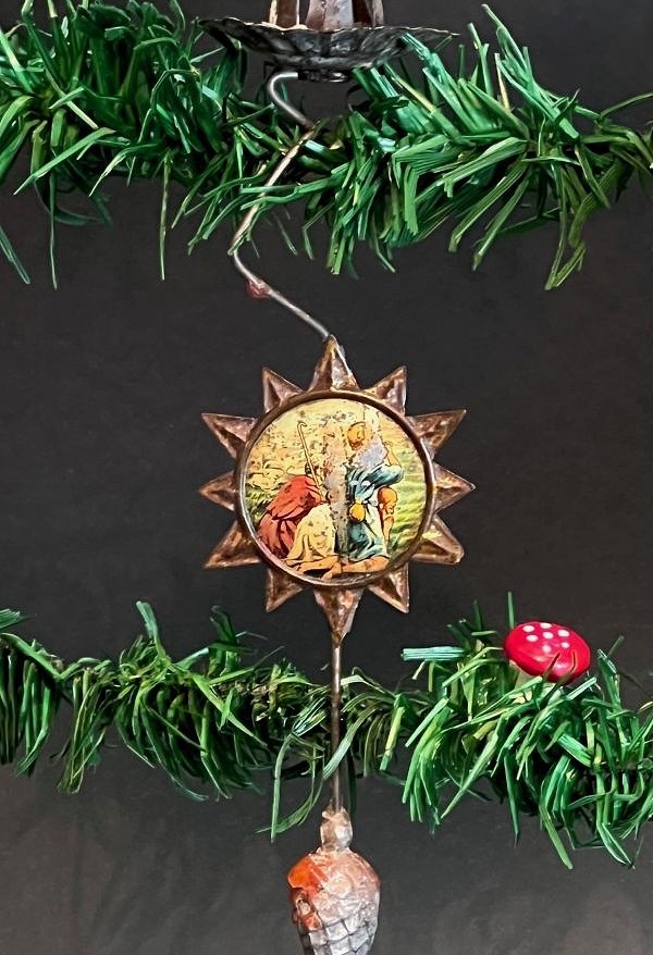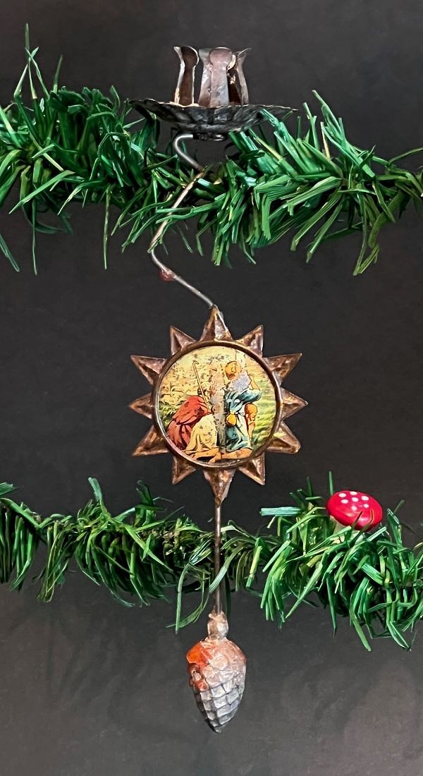 Ancient, antique pendulum candle holder with lithograph of praying shepherds