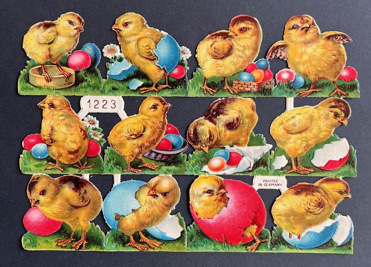 Antique scrap sheet featuring small chicks in colourful eggshells