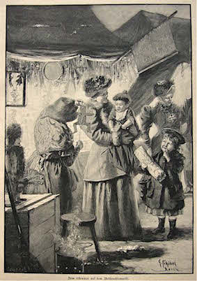 Antiker Holzstich ' Zum ersten Mal auf dem Weihnachtsmarkt ' 1895