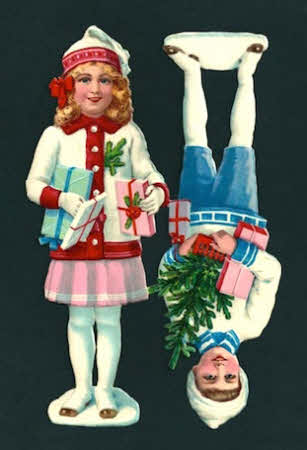 Zwei Weihnachtskinder mit Federbäumchen und Geschenken von L&B