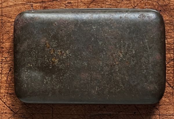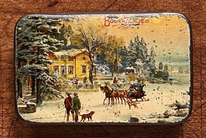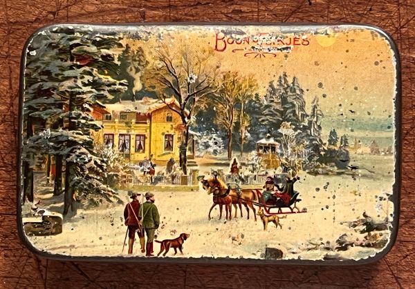 Antike Bonbondose aus Blech mit schöner, lithographierter Winterszene