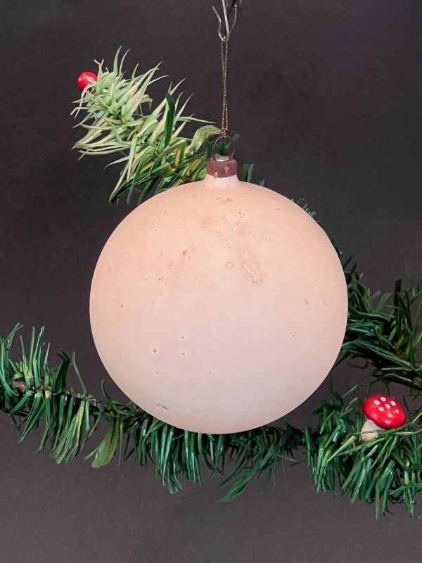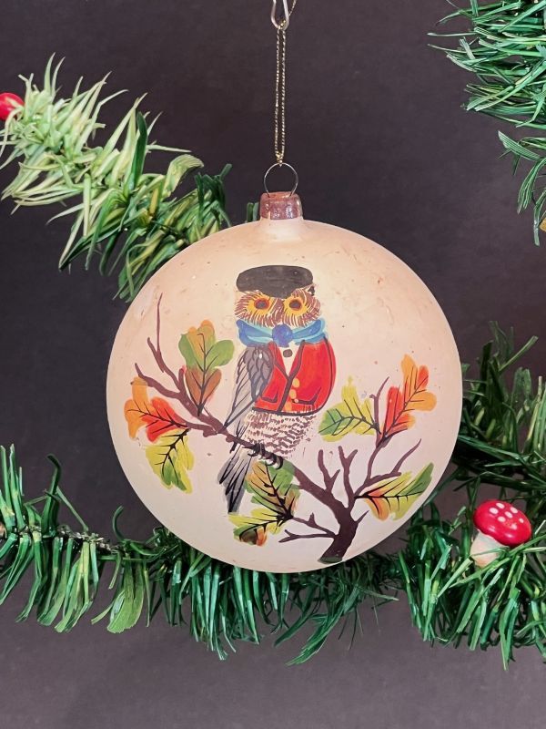 Wunderschöne, antike Kugel mit handgemalter Eule im Frack in herbstlichem Baum