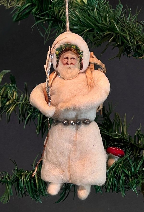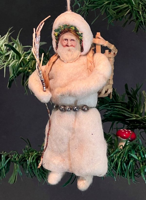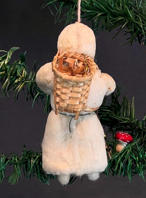Antiker Weihnachtsmann aus Watte mit Kiepe auf dem Rücken