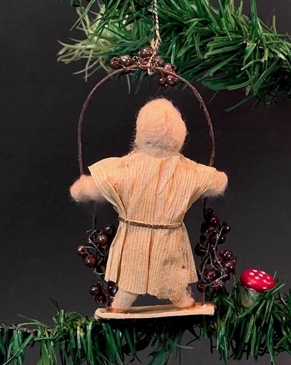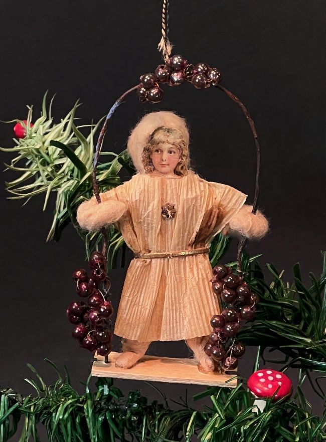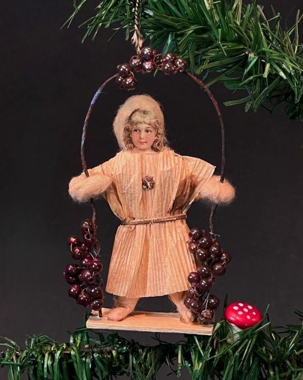 Antikes Wattemädchen auf Schaukel mit Trauben geschmückt