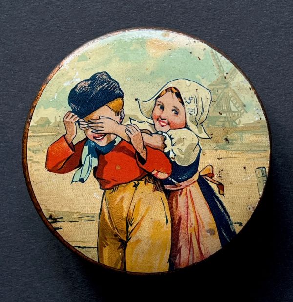 Antike lithographierte Blechdose mit zwei Holländerkindern