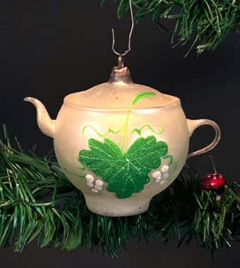 Old teapot with vine leaf decor and glimmered with Venetian dew